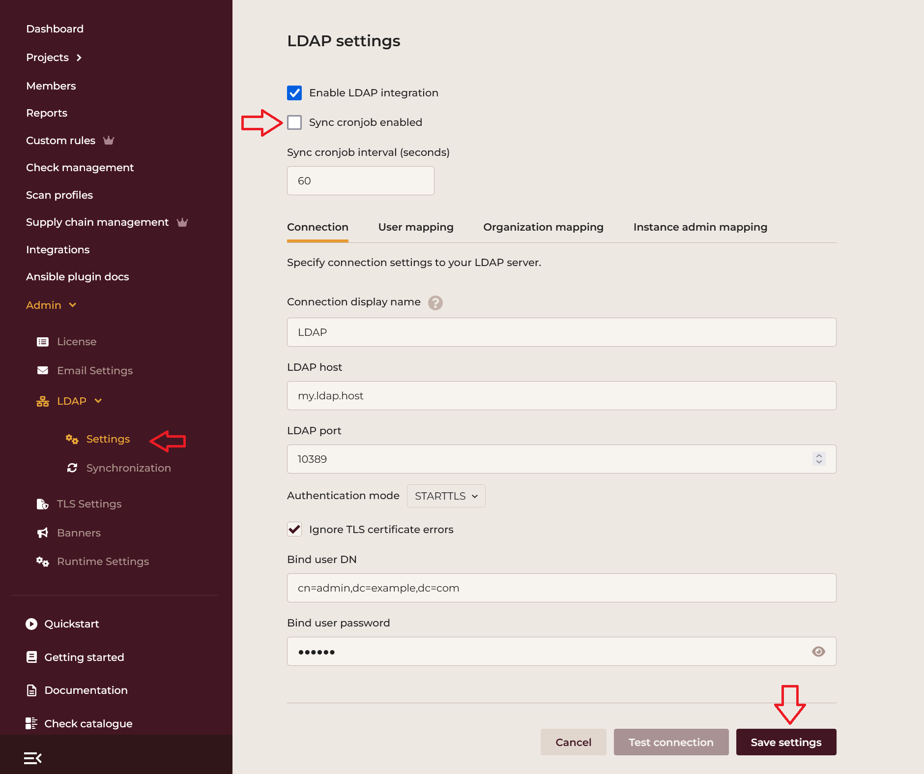 To ensure that LDAP synchronization does not adversely affect users during the process, it is strongly recommended to disable the LDAP synchronization cronjob. Do this by using your browser to navigate to Admin > LDAP > Settings as an instance administrator, unselecting the Sync cronjob enabled checkbox, and saving the settings.