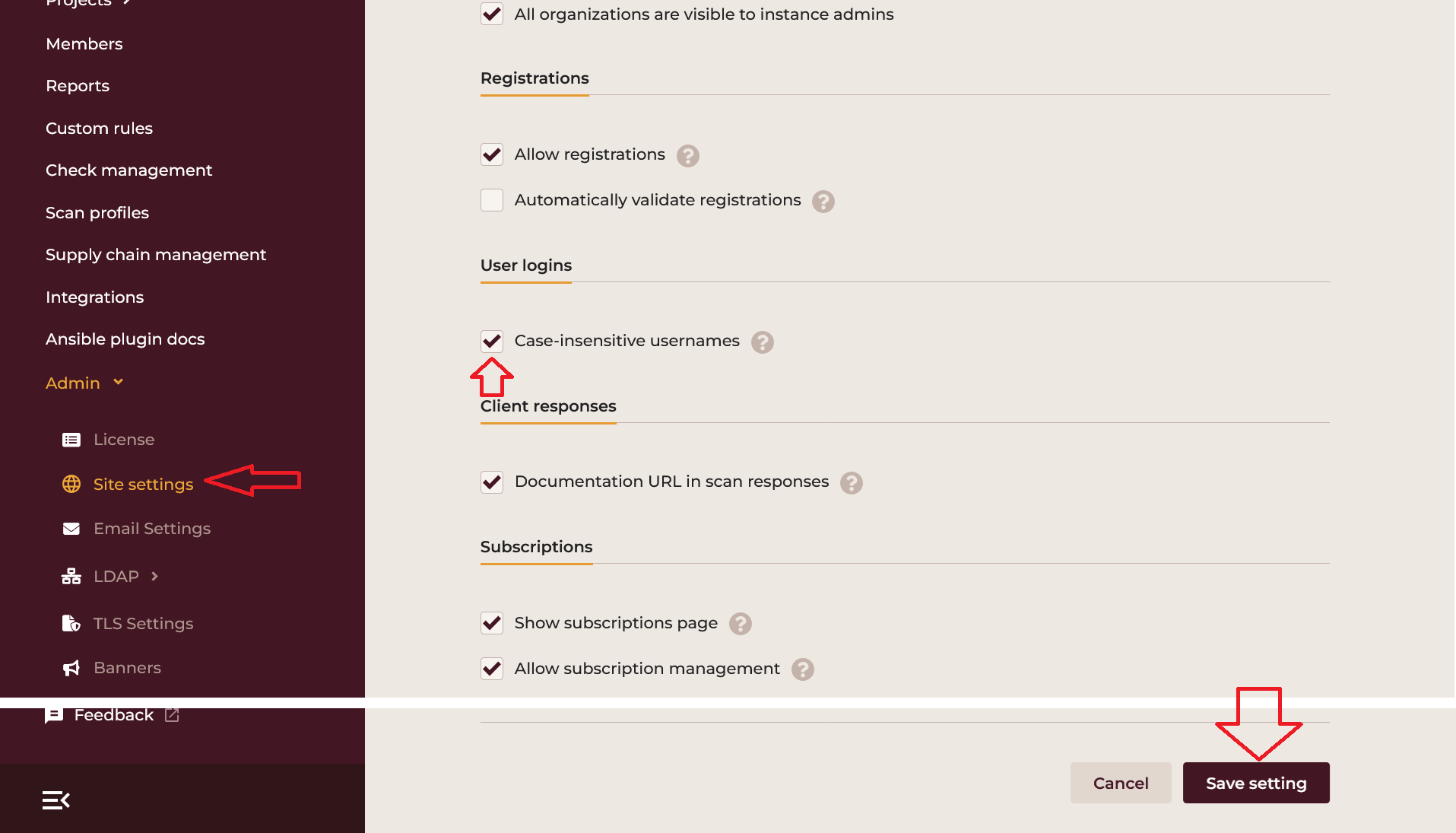 Navigate to the Admin > Site settings as an instance administrator in the browser, look for the User logins section, and enable the Case-insensitive usernames option by setting the check in the checkbox, then save the settings.