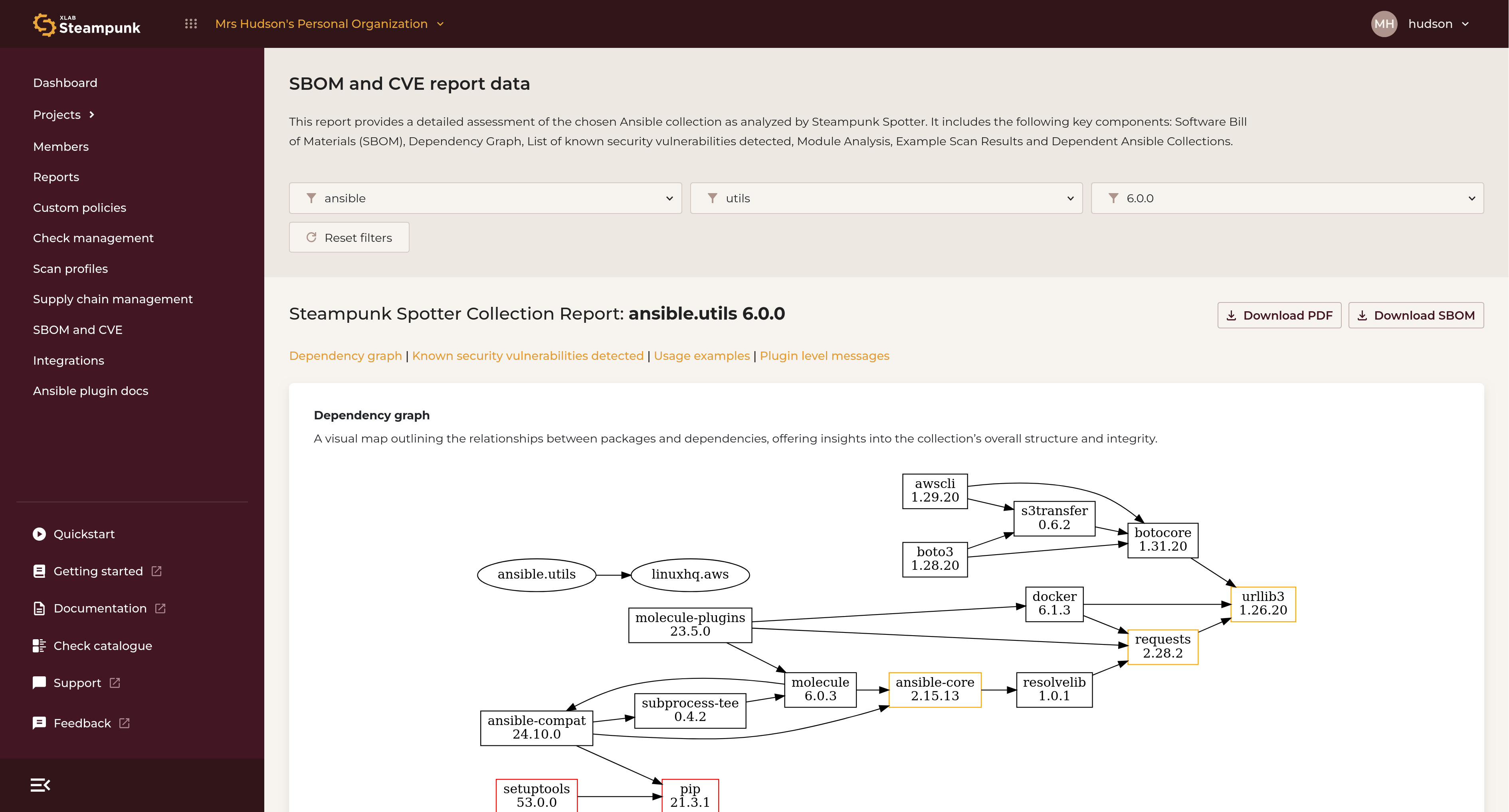SBOM and CVE is a feature in Steampunk Spotter that allows you to view SBOM and CVE report data of the chosen Ansible collection as analyzed by Steampunk Spotter. It includes the following key components: Software Bill of Materials (SBOM), Dependency Graph, List of known security vulnerabilities detected, Module Analysis, Example Scan Results and Dependent Ansible Collections.